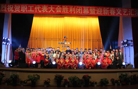 為了慶祝公司第一屆一次職工代表大會(huì)順利閉幕,活躍公司廣大職工的文化生活,讓員工提前度過(guò)一個(gè)歡樂(lè)、祥和的春節(jié),在公司黨支部和工會(huì)委員會(huì)的精心策劃下,在基層分會(huì)全體員工的的共同努力下,加班加點(diǎn)排練節(jié)目,為了使每個(gè)動(dòng)作表演到位有效果,演出精彩上檔次,職工對(duì)節(jié)目一遍又一邊遍的進(jìn)行排練、修正,并籌集了演出的服裝、道具,以最高的表演水平充分展示金維公司員工的良好精神面貌。2013年1月19日下午16時(shí),由公司黨支部和工會(huì)委員會(huì)聯(lián)合舉辦的慶祝公司第一屆一次職工代表大會(huì)順利閉幕暨“迎新春”文藝節(jié)目匯演大型晚會(huì),在一片歡慶祥和的新春祝語(yǔ)聲中拉開了帷幕,公司總經(jīng)理陳德剛、副總理高勇、副總經(jīng)理魏偉、財(cái)務(wù)總監(jiān)高廣禮、生產(chǎn)總監(jiān)王智和公司工會(huì)主席劉海玉等領(lǐng)導(dǎo)和公司全體員工觀看了文藝節(jié)目演出活動(dòng)。