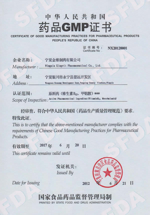 寧夏金維制藥有限公司成立于2010年7月,位于寧夏銀川市望遠(yuǎn)經(jīng)濟(jì)開發(fā)區(qū),是一家專業(yè)生產(chǎn)維生素系列原料藥產(chǎn)品的企業(yè),主要生產(chǎn)維生素B12、氰鈷胺、甲鈷胺、腺苷鈷胺、維生素B12飼料添加劑等維生素系列產(chǎn)品。我公司自成立以來,嚴(yán)格按照《藥品生產(chǎn)質(zhì)量管理規(guī)范(2010年修訂)》的有關(guān)規(guī)定,通過組織人員培訓(xùn)、修訂和完善文件資料等不斷夯實(shí)軟件基礎(chǔ)工作,并對(duì)廠房和生產(chǎn)設(shè)施等硬件方面進(jìn)行改造,逐步建立健全和完善了質(zhì)量管理體系,使我公司的質(zhì)量管理工作實(shí)現(xiàn)了規(guī)范化和正規(guī)化管理。經(jīng)我公司申請(qǐng),寧夏回族自治區(qū)食品藥品監(jiān)督管理局GMP現(xiàn)場檢查驗(yàn)收專家組根據(jù)《藥品生產(chǎn)質(zhì)量管理規(guī)范(2010年修訂)》的規(guī)定,于2012年4月17日至4月20日對(duì)我公司生產(chǎn)的原料藥(維生素B12、甲鈷胺)進(jìn)行現(xiàn)場檢查和審核,經(jīng)專家組綜合評(píng)定我公司符合相關(guān)規(guī)定并于2012年06月20日頒發(fā)了《藥品GMP證書》。認(rèn)證范圍為原料藥(維生素B12、甲鈷胺),證書編號(hào)為NX20120001,目前我公司為寧夏回族自治區(qū)首家通過新版藥品GMP認(rèn)證的企業(yè)。